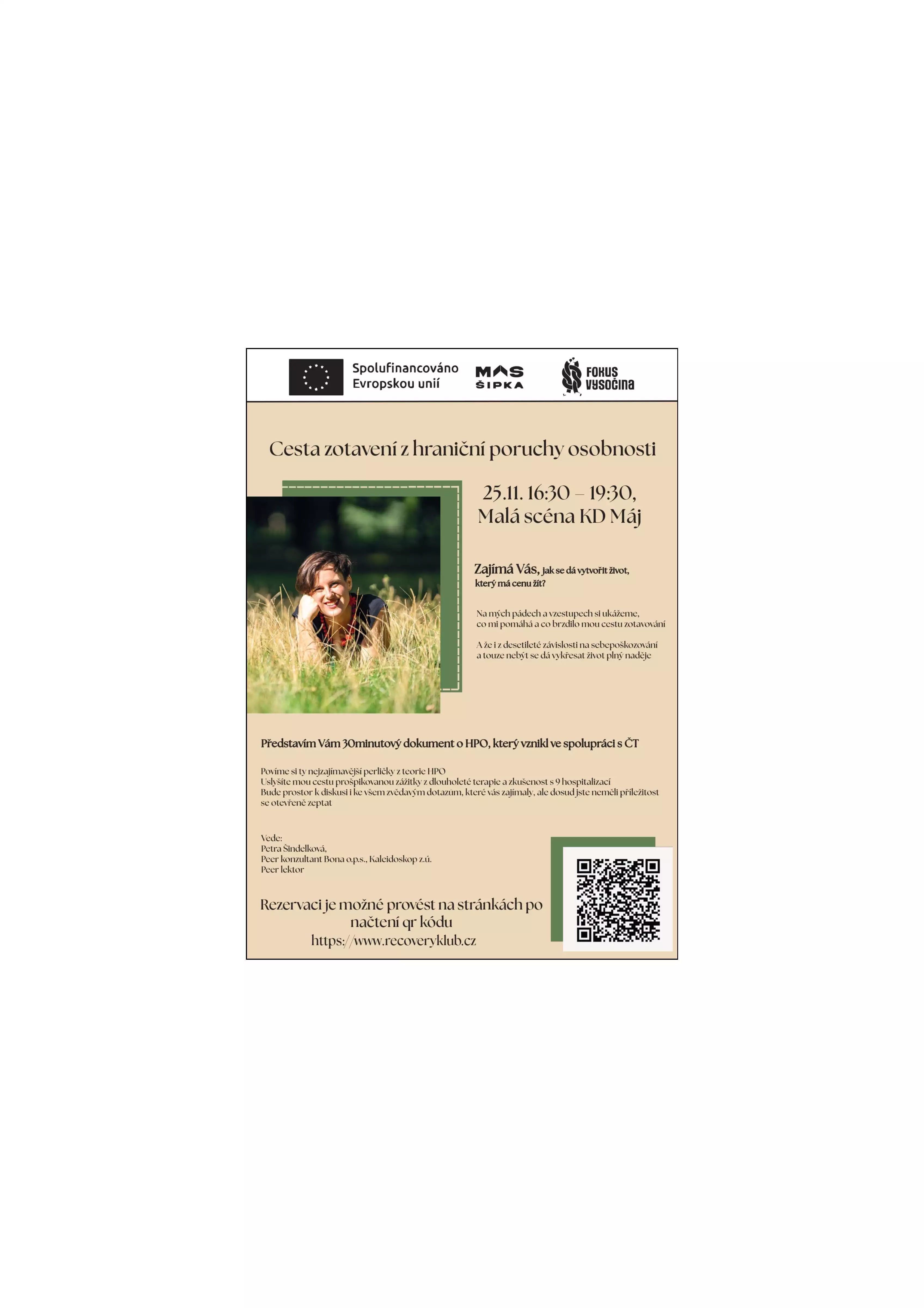 Petřin příběh, spolu s třicetiminutovým dokumentem, který o ní natočila Česká televize, přinese beseda s názvem „Cesta zotavení z hraniční poruchy osobnosti“. Beseda je podpořena našimi partnery – EU, MAS Šipka a FOKUS Vysočina –a vstupné je dobrovolné.