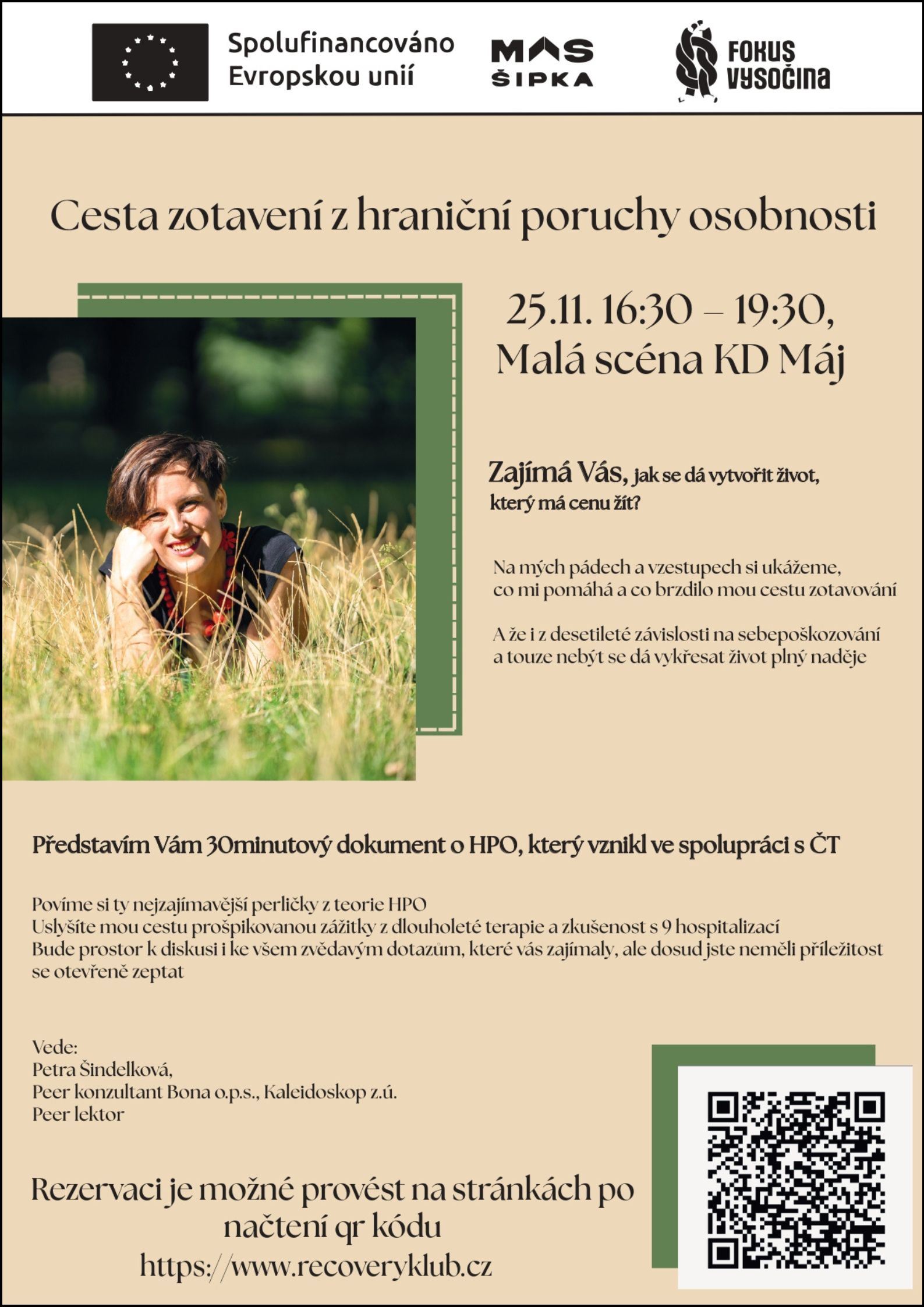Petřin příběh, spolu s třicetiminutovým dokumentem, který o ní natočila Česká televize, přinese beseda s názvem „Cesta zotavení z hraniční poruchy osobnosti“. Beseda je podpořena našimi partnery – EU, MAS Šipka a FOKUS Vysočina –a vstupné je dobrovolné.