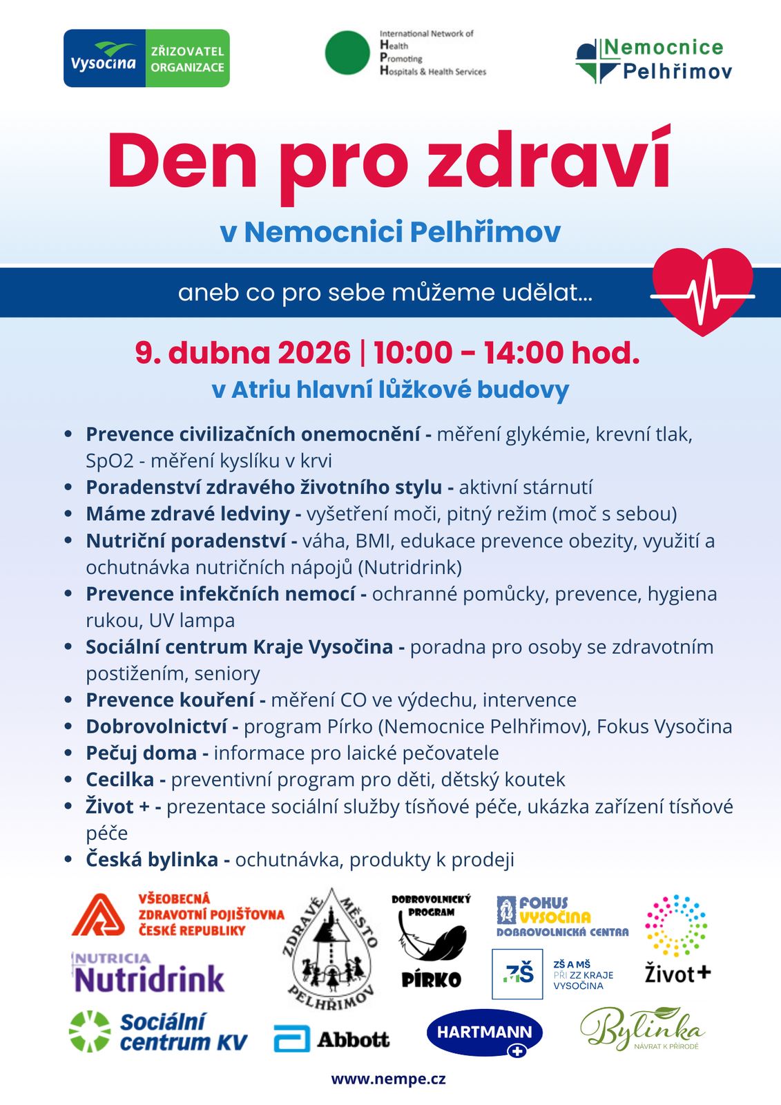 Nemocnice Pelhřimov připravila pro veřejnost Den pro zdraví, který se uskuteční ve čtvrtek 9. dubna od 10 do 14 hodin v atriu hlavní lůžkové budovy. Akce se koná ve spolupráci se Zdravým městem Pelhřimov. Návštěvníci si zde budou moci zdarma nechat změřit vybrané zdravotní ukazatele a získat užitečné rady, jak pečovat o své zdraví.