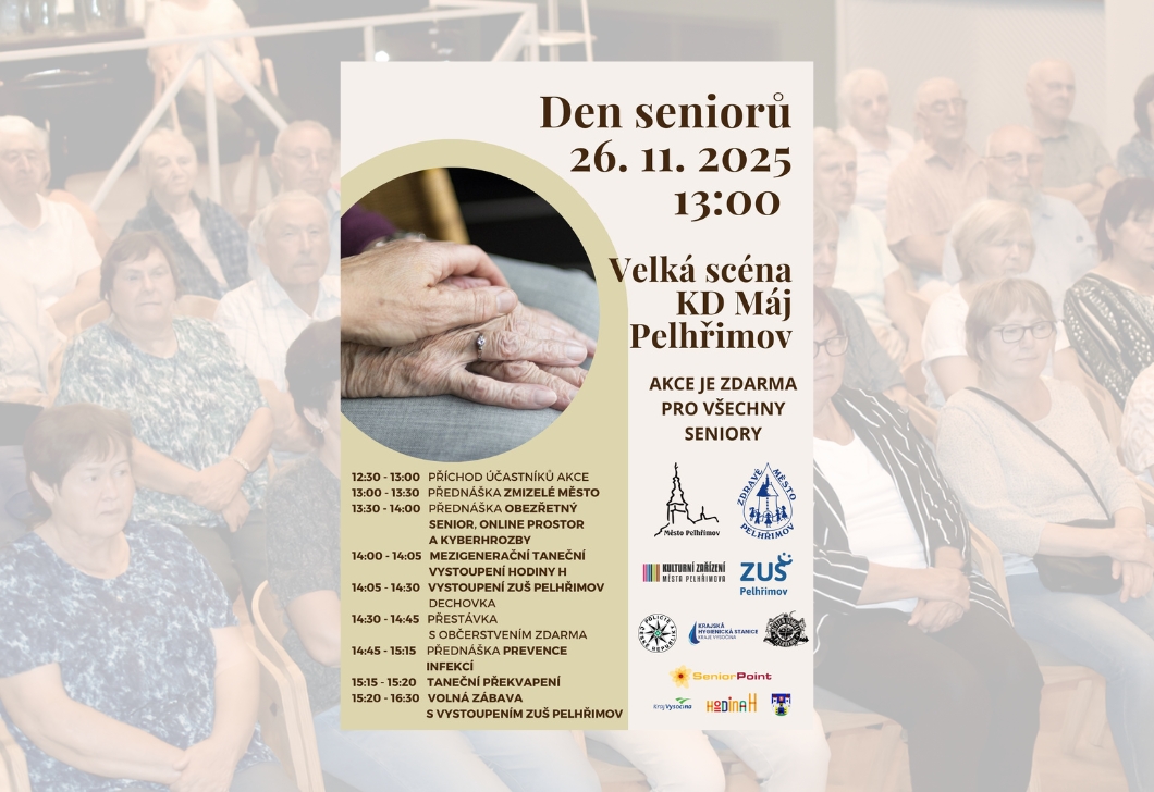 Zdravé město Pelhřimov, Hodina H - Senior Point, ZUŠ Pelhřimov a Kulturní zařízení města Pelhřimova uspořádají ve středu 26. listopadu od 13 hodin na velké scéně KD Máj Den seniorů. Návštěvníci se mohou těšit na bohatý kulturní i vzdělávací program.