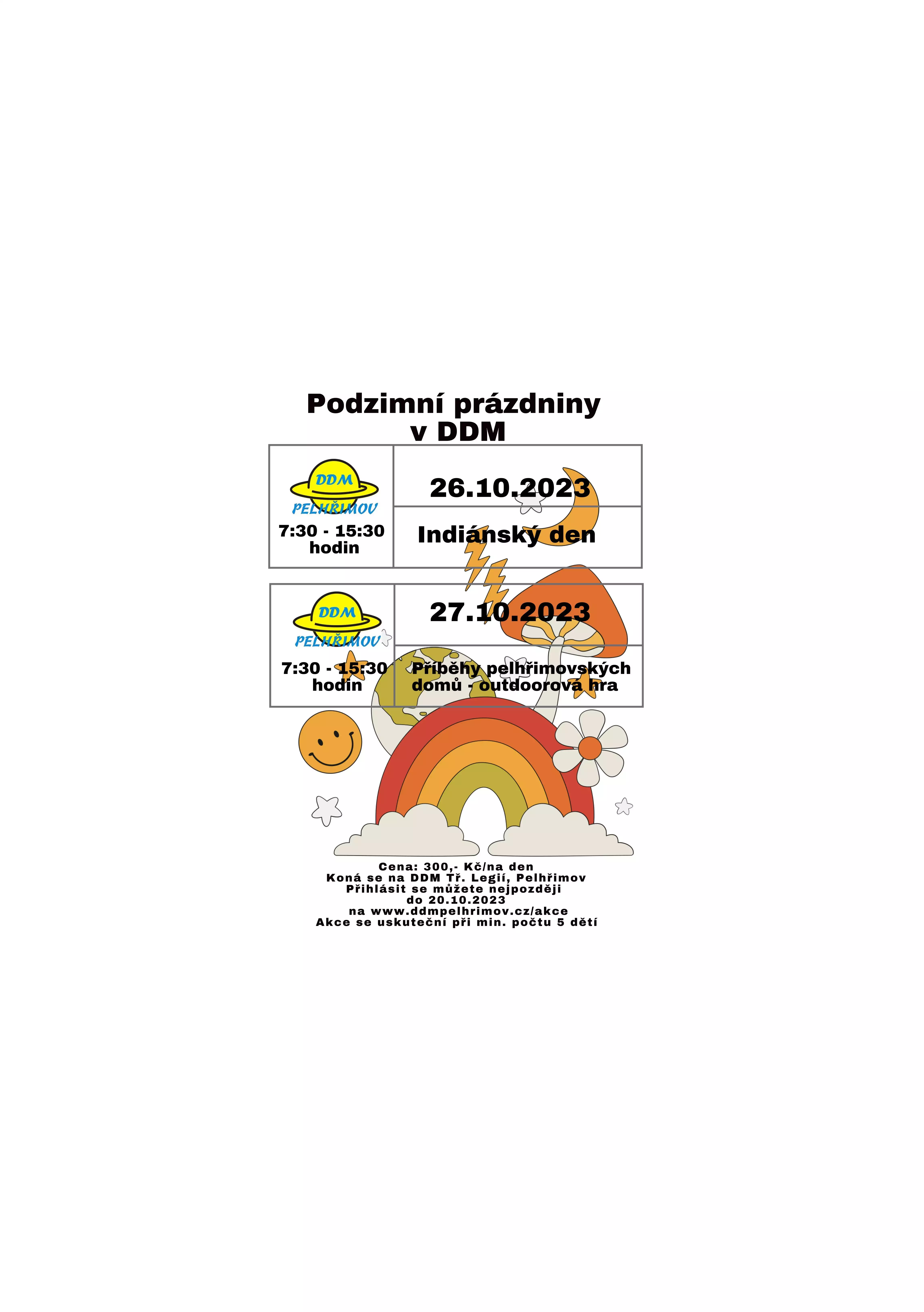 Po oba dva dny je nachystán program od 7.30 do 15.30 hodin. Cena je 300 korun na den. Přihlášky jsou přijímány do 20. října na www.ddmpelhrimov/akce. Akce se uskuteční při minimálním počtu pěti dětí.