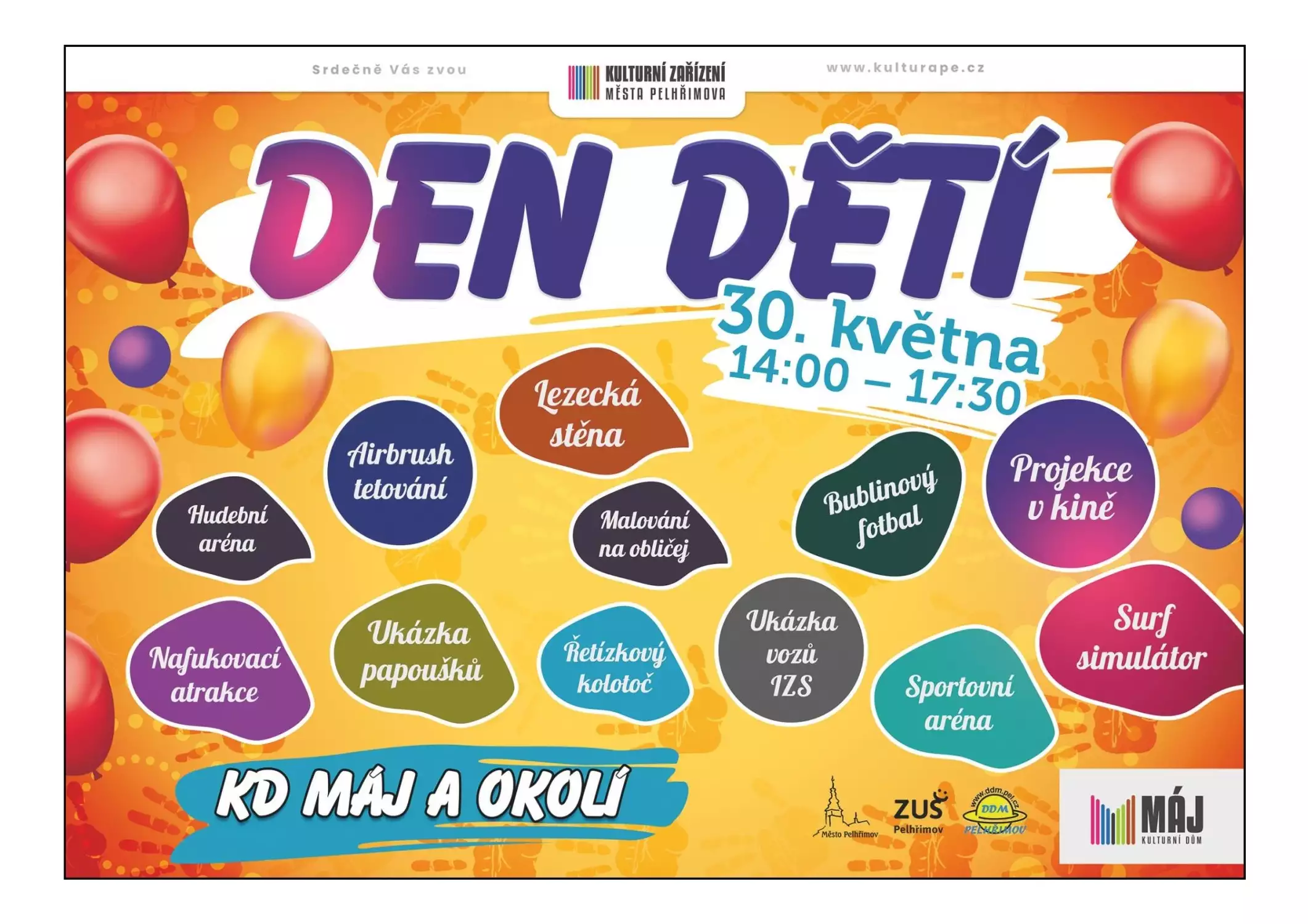 Přijďte s námi oslavit Den dětí. V pátek 30. května od 14.00 ožije prostranství před kulturním domem Máj a hřiště Kalvárie bohatým programem plným her, zábavy a radosti. Kulturní zařízení města Pelhřimova připravily pestré odpoledne, kde si každé dítě přijde na své. Všechny atrakce jsou navíc zdarma. Nechte se zlákat a přijďte si užít den, který bude patřit jen dětem.