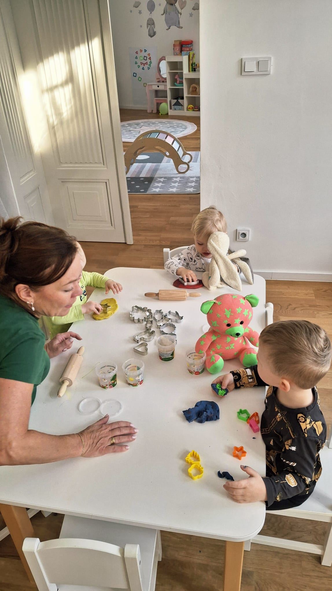 Denní režim se od mateřské školy příliš neliší – vycházíme i z rámcového vzdělávacího programu, ale v jednodušší formě. Dětská skupina je však primárně sociální služba, takže větší důraz klademe na péči, samostatnost a celkový rozvoj dítěte. Ráno děti přicházejí, mají prostor pro volnou hru a postupně se zapojují do jednoduchých řízených aktivit – krátkých, hravou formou, často s využitím písniček, říkanek a pohybu. Důležitou roli hrají rituály, které dětem pomáhají orientovat se v průběhu dne. Součástí dne je také hygiena, svačina, nácvik sebeobsluhy i spolupráce s ostatními dětmi. Celé prostředí se snažíme vést v rodinném duchu, aby se děti cítily bezpečně a přirozeně se připravovaly na přechod do mateřské školy.