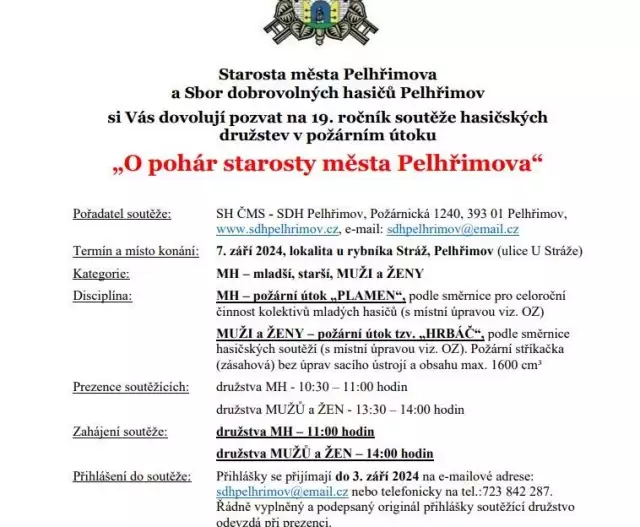 V sobotu ráno areál rybníka Stráž převezmou pelhřimovští dobrovolní hasiči. Pořádají už 19. ročník soutěže družstev v požárním útoku s názvem O pohár starosty města Pelhřimova. Družstva mladých hasičů budou soutěžit od 11 hodin, mužů a žen od 14 hodin.