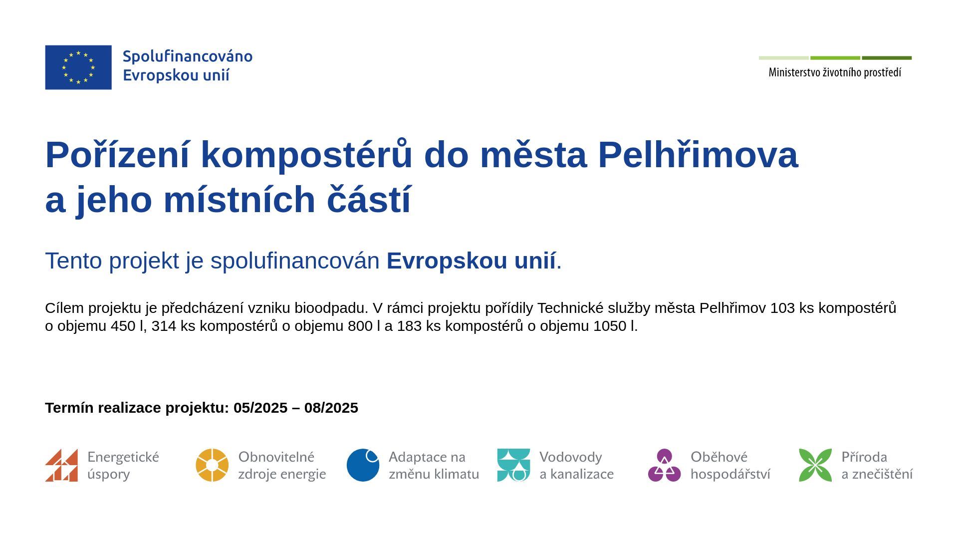 - Kompostéry byly pořízeny v rámci projektu „Pořízení kompostérů do města Pelhřimova a jeho místních částí“, spolufinancovaného Evropskou unií. Nákup byl realizován díky Výzvě Ministerstva životního prostředí z Operačního programu Životní prostředí 2021–2027, podporovaného z Fondu soudržnosti.