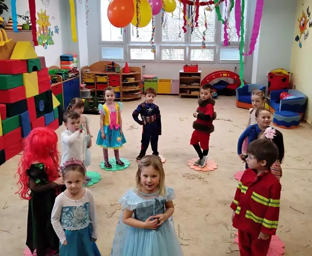 V den karnevalu se školka proměnila v pohádkové království. Děti v maskách představovaly své kostýmy, tančily, zpívaly a účastnily se různých her a soutěží. Při odpočinku se občerstvily dobrůtkami, které si přinesly z domova a připily si „na zdraví“ dětským šampíčkem. Na závěr akce jsme si samozřejmě museli udělat společné foto.