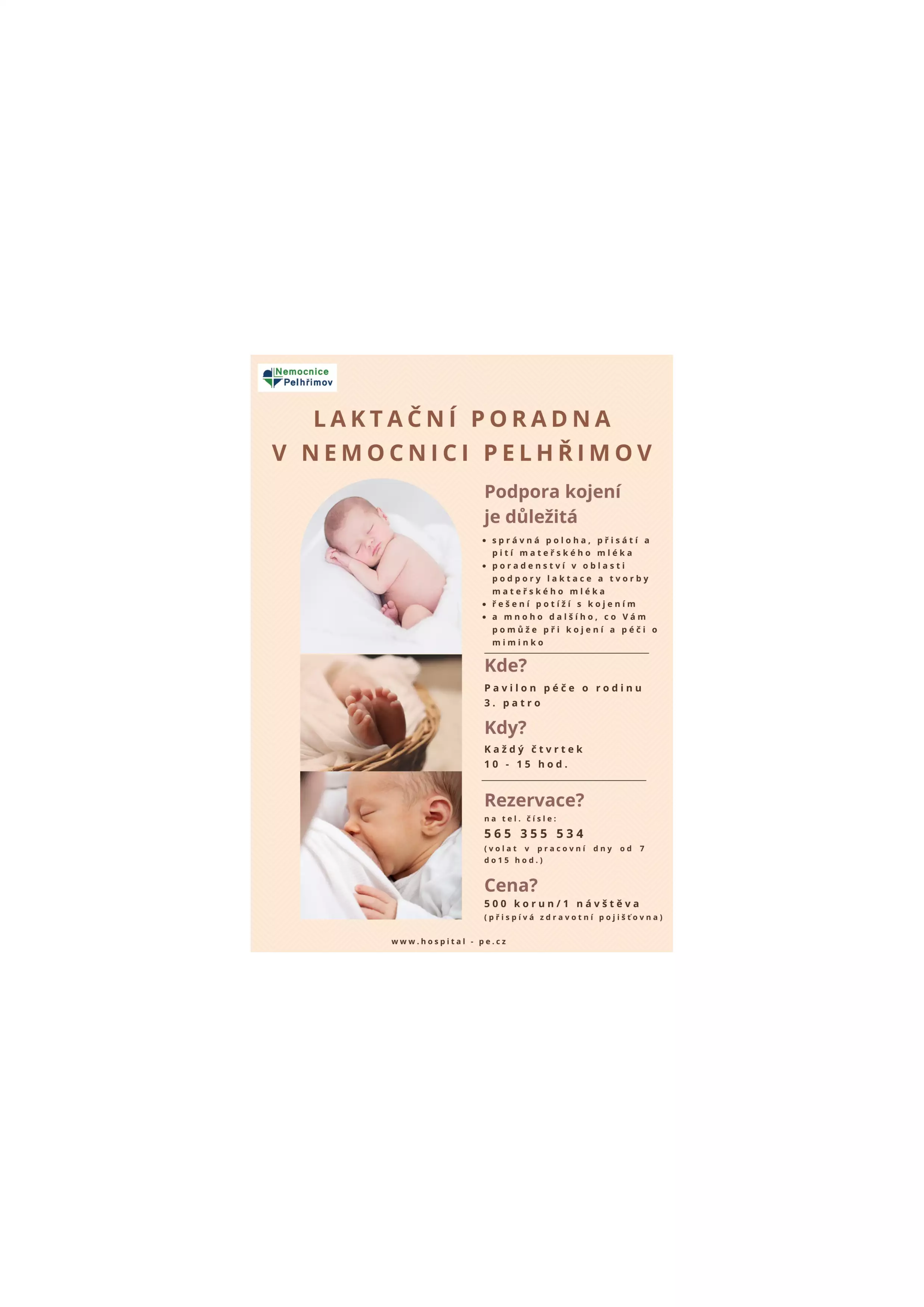 Podporu v oblasti kojení a péče o dítě po porodu nabízí nově Nemocnice Pelhřimov. Od února nemocnice otevřela při dětském oddělení Laktační poradnu, kde působí certifikovaná laktační poradkyně. Poradna je otevřena každý čtvrtek v Pavilonu péče o rodinu ve 3. patře od 10:00 do 15:00 hodin. Pro rezervaci místa si maminky mohou zatelefonovat v pracovní dny od 7:00 do 15:30 hodin na telefonní číslo 565 355 534.