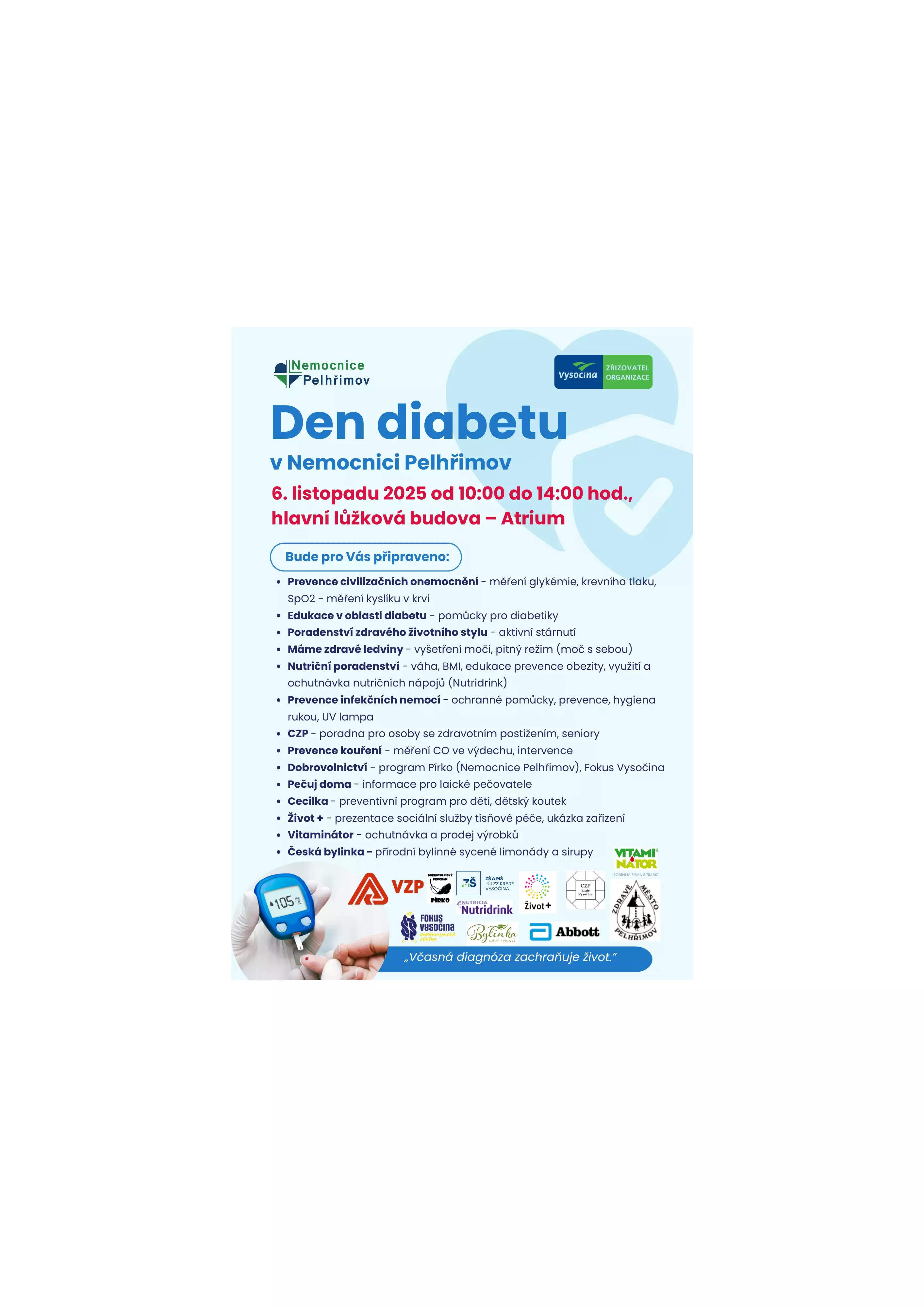 Nemocnice Pelhřimov ve spolupráci se Zdravým městem Pelhřimov zve veřejnost na Den diabetu, akci zaměřenou na důležitost prevence diabetu a civilizačních onemocnění. Uskuteční se ve čtvrtek 6. listopadu v Atriu hlavní lůžkové budovy od 10 do 14 hodin.