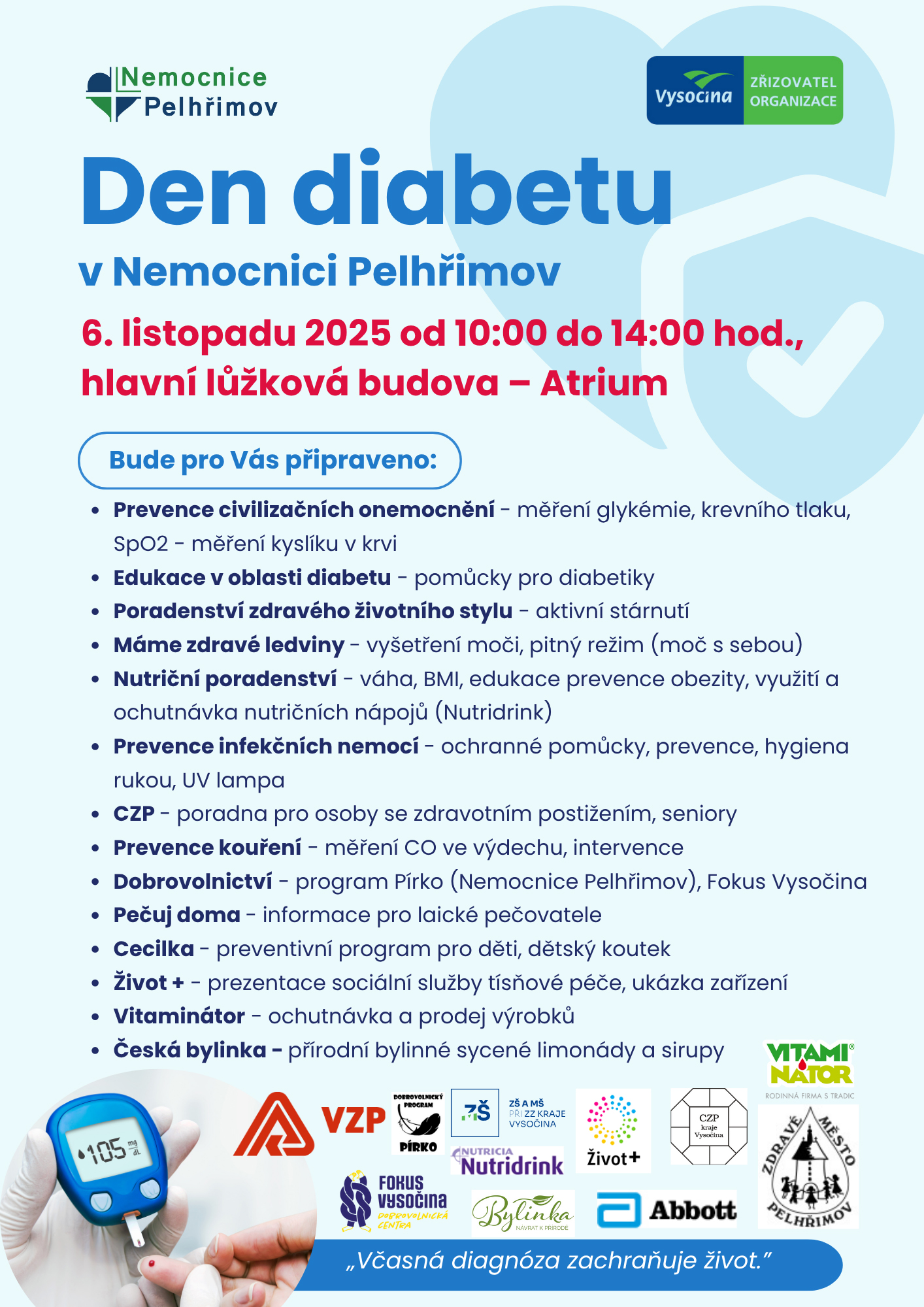 Nemocnice Pelhřimov ve spolupráci se Zdravým městem Pelhřimov zve veřejnost na Den diabetu, akci zaměřenou na důležitost prevence diabetu a civilizačních onemocnění. Uskuteční se ve čtvrtek 6. listopadu v Atriu hlavní lůžkové budovy od 10 do 14 hodin.