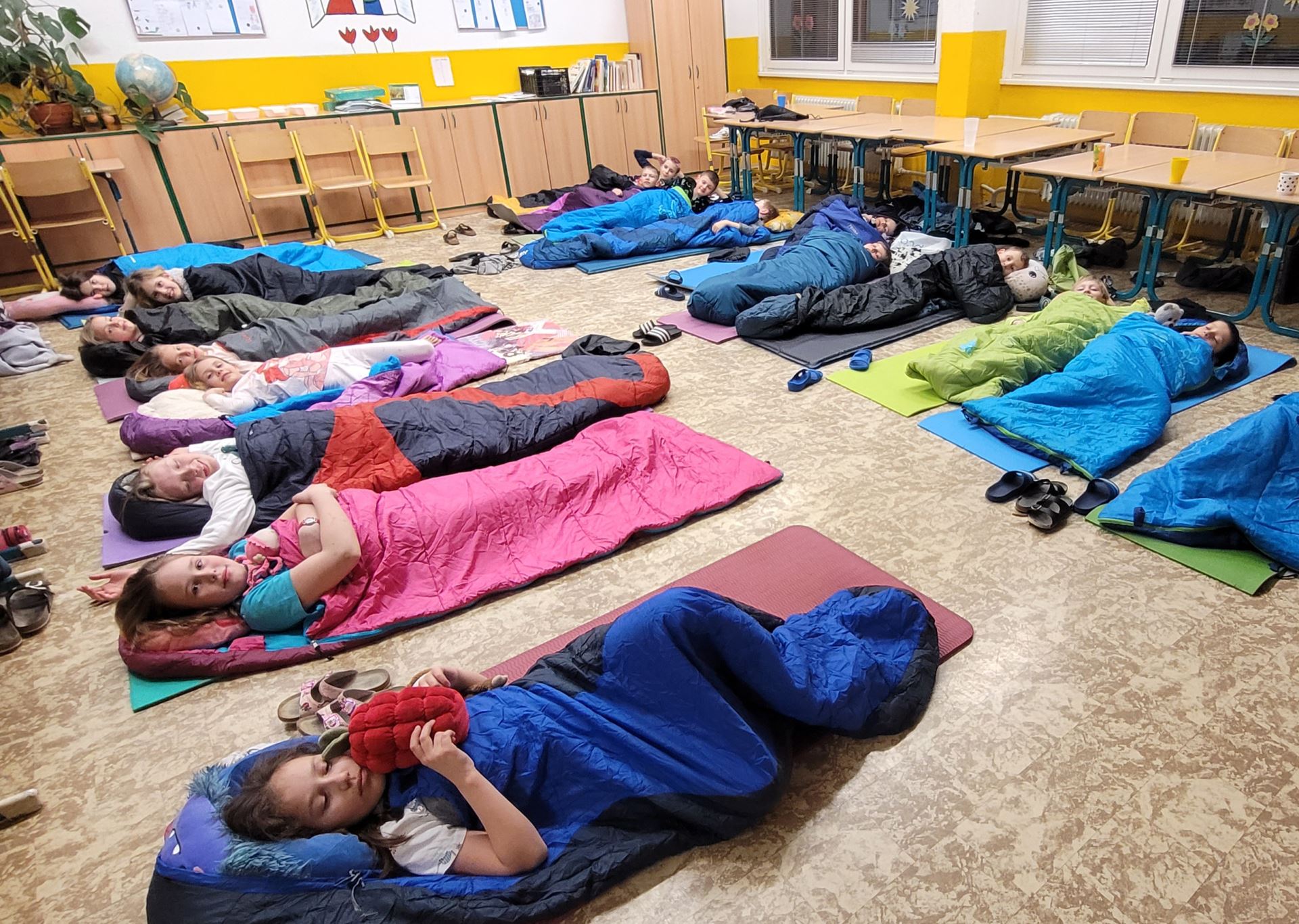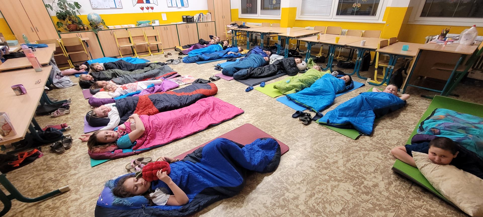 Po dobrodružné části se naše třída proměnila ve velkou společnou ložnici. Děti si rozložily spacáky, sdílely své zážitky a postupně se ukládaly ke spánku za doprovodu tichého povídání a doznívající atmosféry celého dne.