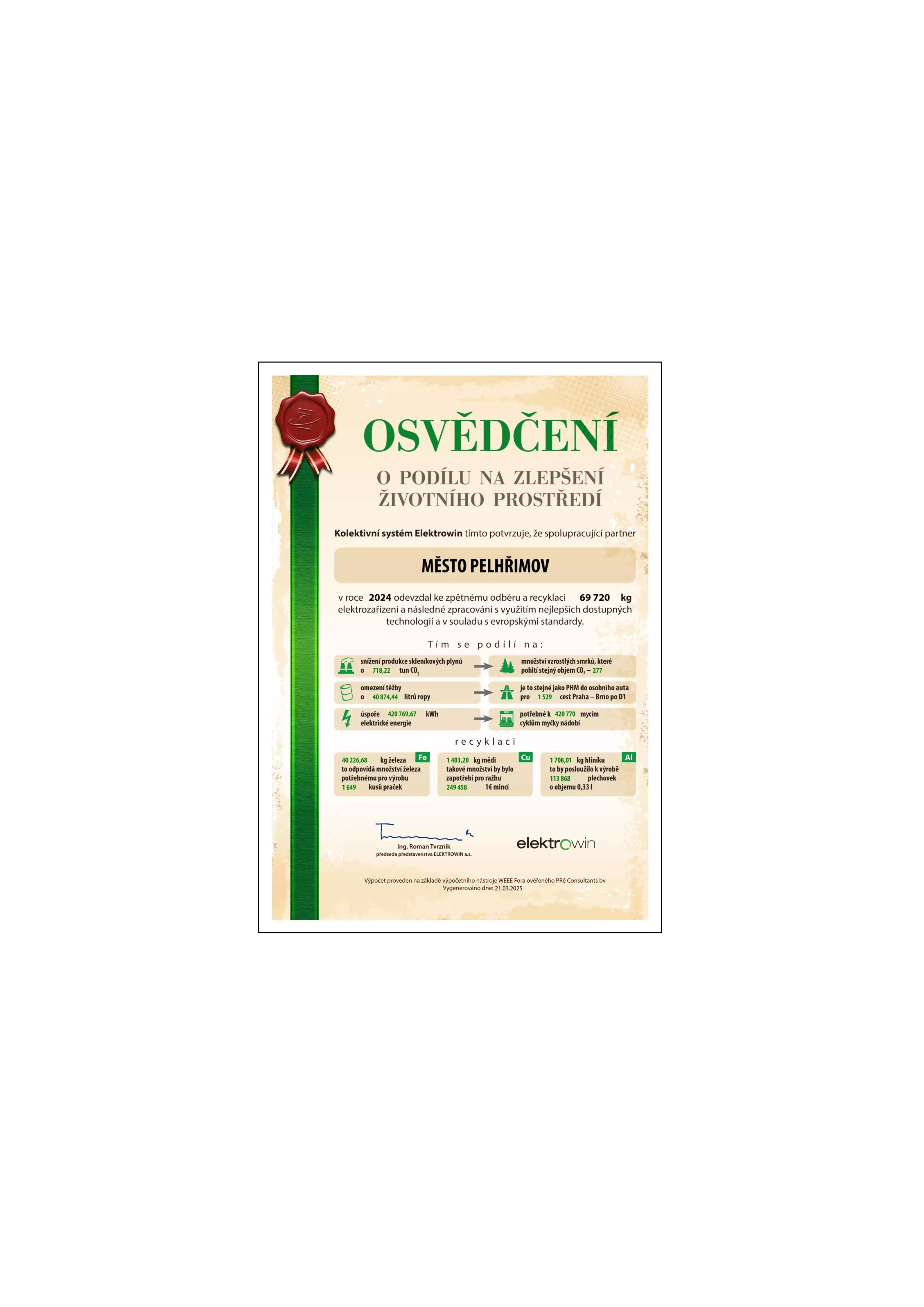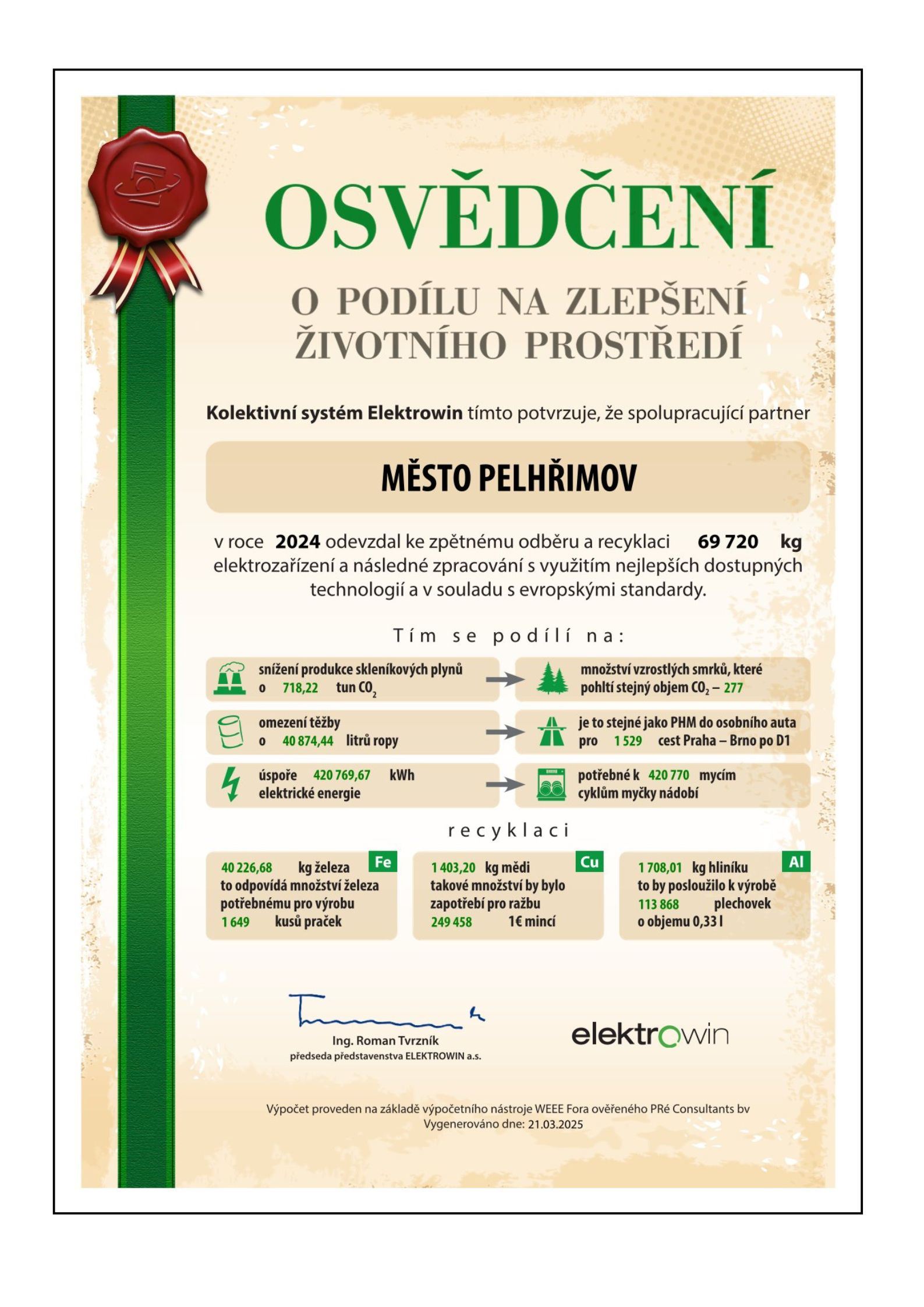 Z Osvědčení o podílu na zlepšení životního prostředí od společnosti Elektrowin vyplývá, že jsme díky recyklaci dosáhli: