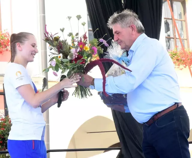 Pelhřimovskou rodačku a účastnici olympiády přivítal i starosta Ladislav Med a uvedl: „Chci Dominice Hronové velmi poděkovat za to, že dobře reprezentovala naše město a děkuji i trenéru Petru Lackovi, že v Pelhřimově vychovává a vede děti ke sportu,“ řekl na pódiu a předal olympioničce dárek. Akce se dále zúčastnili z vedení města místostarostové Zdeněk Jaroš a Karel Kratochvíl, radní Filip Hron a pozvání do Pelhřimov přijal i senátor Jaroslav Chalupský.