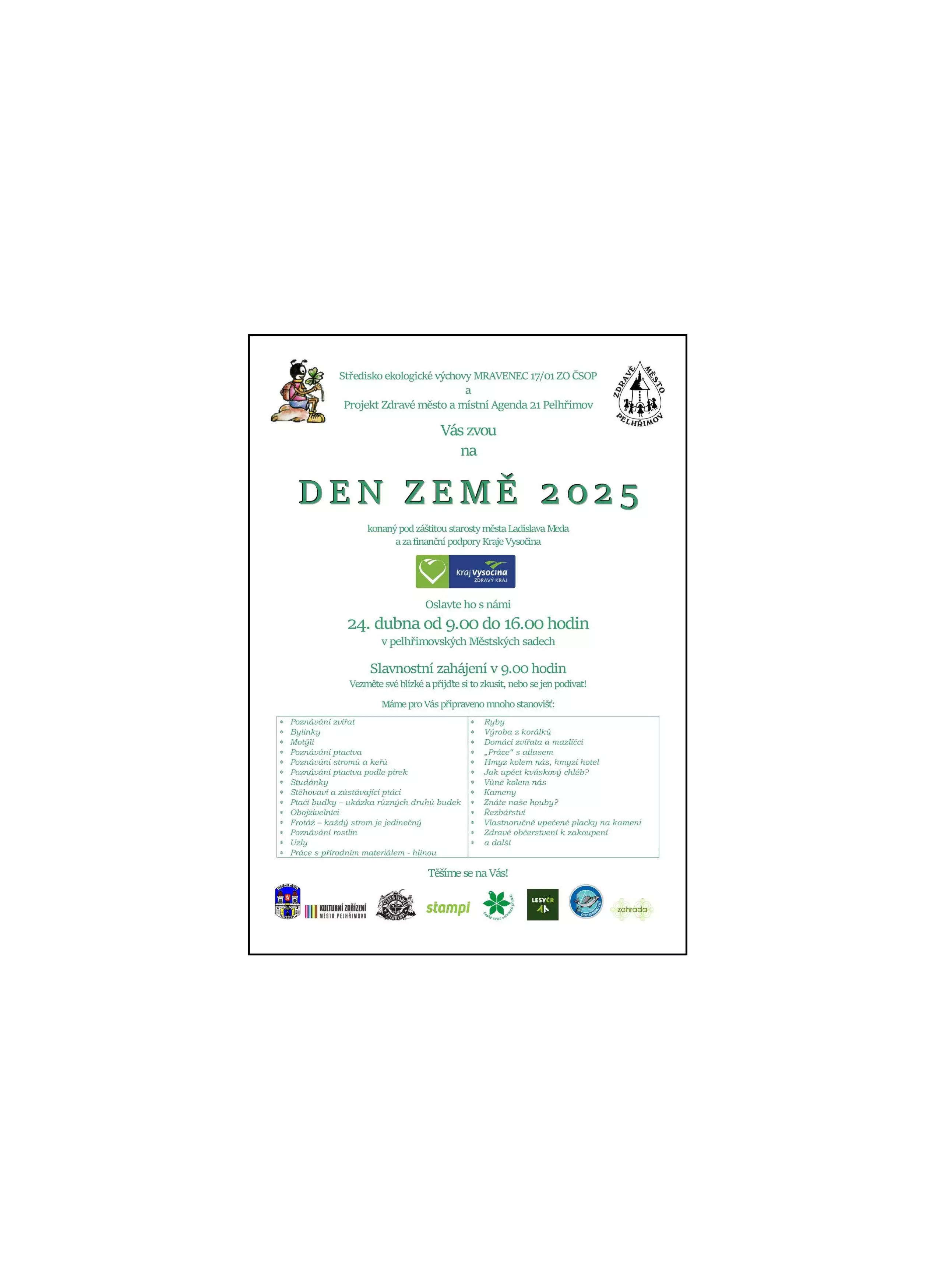 Ve čtvrtek 24. dubna od 9 do 16 hodin se v Městských sadech pod záštitou starosty města Ladislava Meda a za finanční podpory Kraje Vysočina uskuteční oslava Dne Země. Hlavními organizátory jsou Středisko ekologické výchovy MRAVENEC 17/01 ZO ČSOP a Město Pelhřimov.