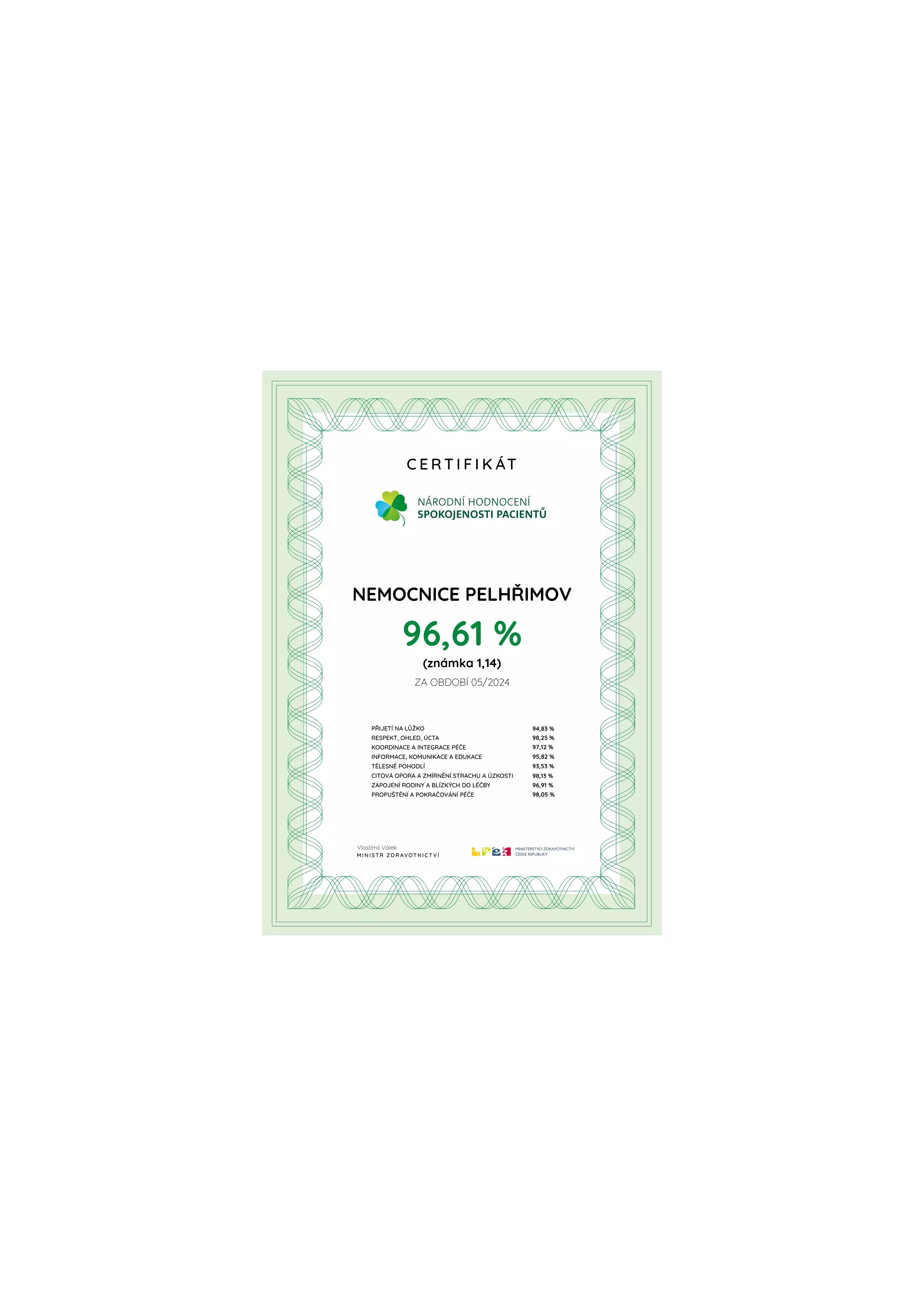 Nemocnice Pelhřimov opět prokázala vysokou úroveň péče o své pacienty. V rámci Národního hodnocení spokojenosti hospitalizovaných pacientů MZČR za rok 2024 obdržela vynikající známku 1,14 (celková spokojenost 96,61 %), která ji řadí mezi přední nemocnice v České republice. Nemocnice se umístila na 3. místě ze sledovaných 27 zařízeních.