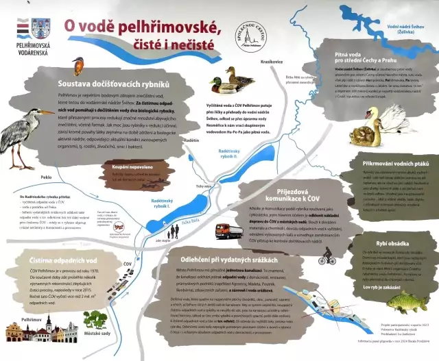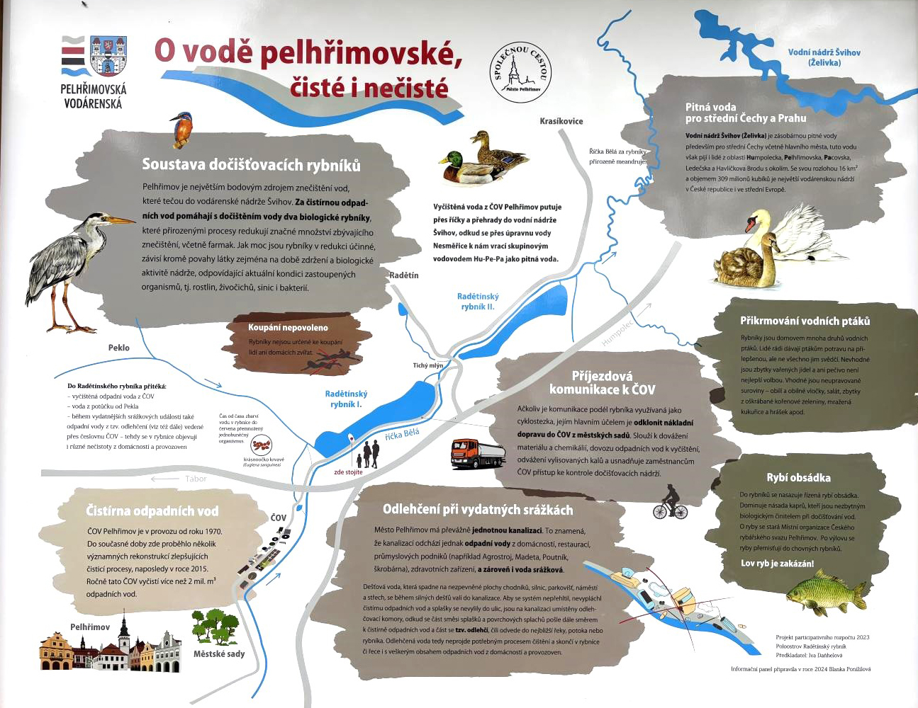 Nově umístěná tabule s názvem O vodě pelhřimovské, čisté i nečisté přehledně vysvětluje celý koloběh vody – od jejího čištění v ČOV Pelhřimov, přes soustavu dočišťovacích rybníků až po návrat čisté vody do říčky Bělé a dále do vodárenské nádrže Švihov, která zásobuje pitnou vodou střední Čechy i Prahu. Návštěvníci se zde dozvědí také o významu biologického čištění, ochraně přírody a vodních živočichů, i o tom, jak město reaguje na zvýšený odtok při vydatných srážkách.