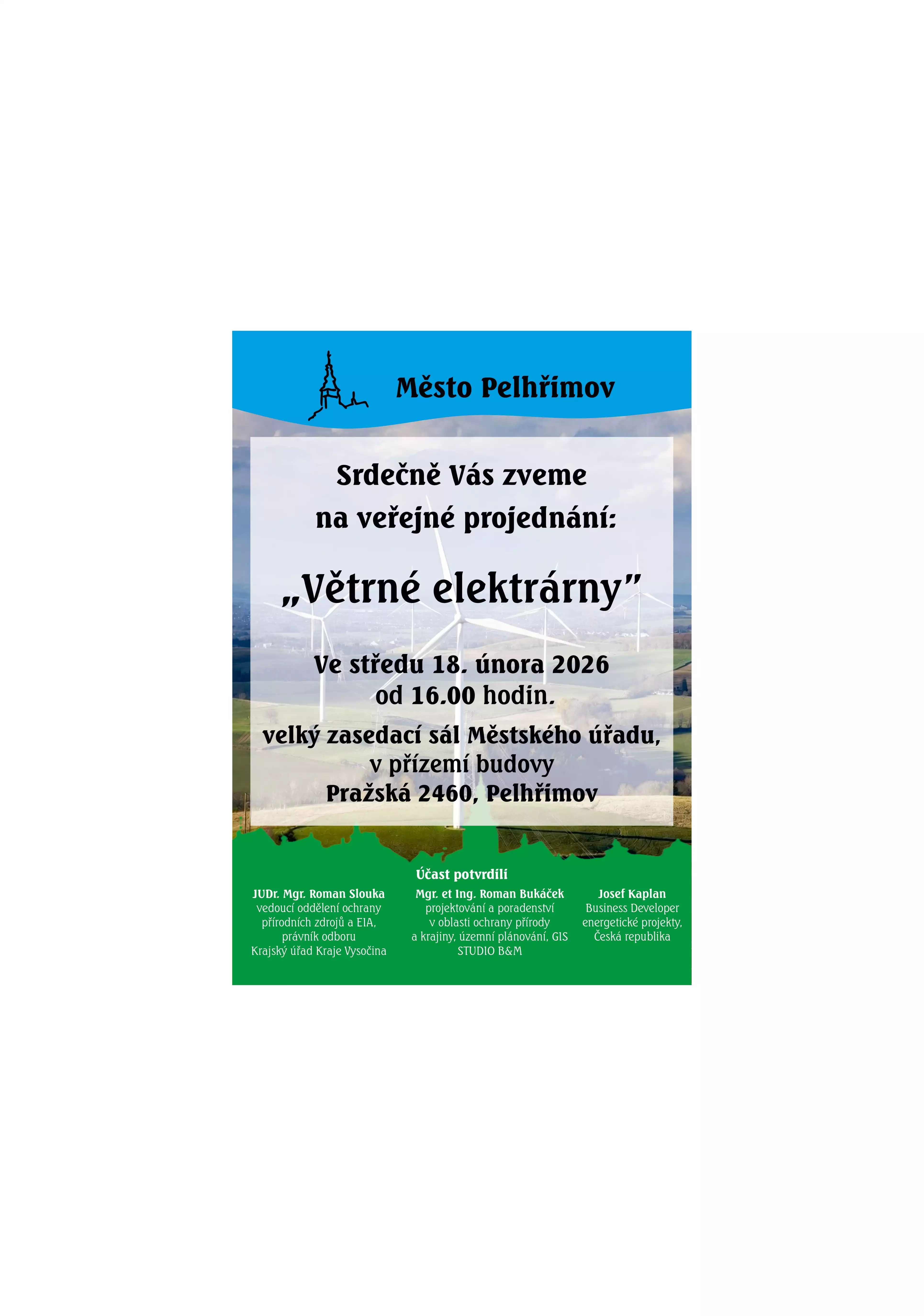 Město Pelhřimov zve na veřejné projednání zaměřené na téma možnosti využití větrného potenciálu na našem území. Veřejné projednání se uskuteční ve středu 18. února od 16:00 ve velkém zasedacím sále Městského úřadu Pelhřimov, Pražská 2460, přízemí.