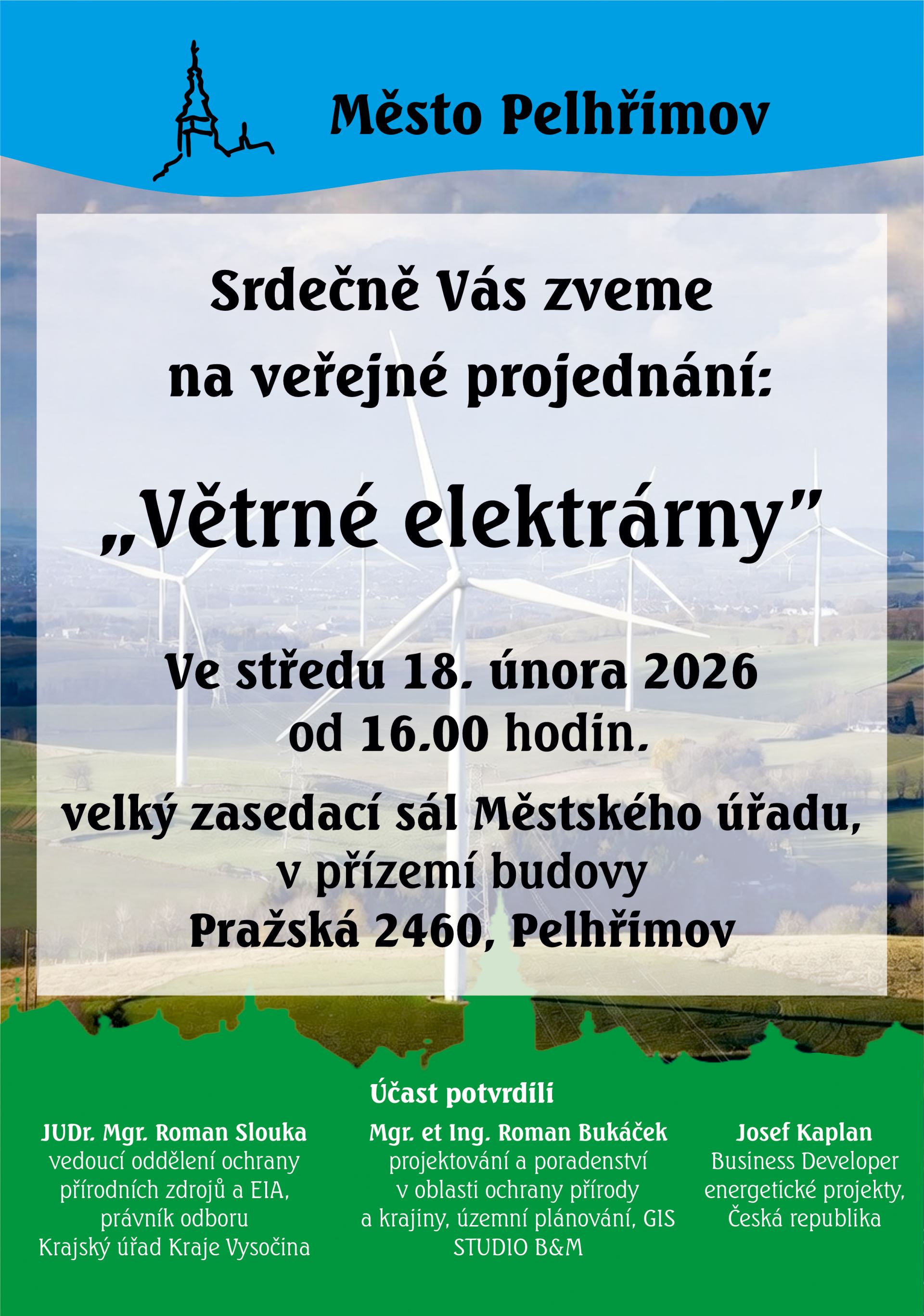 Město Pelhřimov zve na veřejné projednání zaměřené na téma možnosti využití větrného potenciálu na našem území. Veřejné projednání se uskuteční ve středu 18. února od 16:00 ve velkém zasedacím sále Městského úřadu Pelhřimov, Pražská 2460, přízemí.