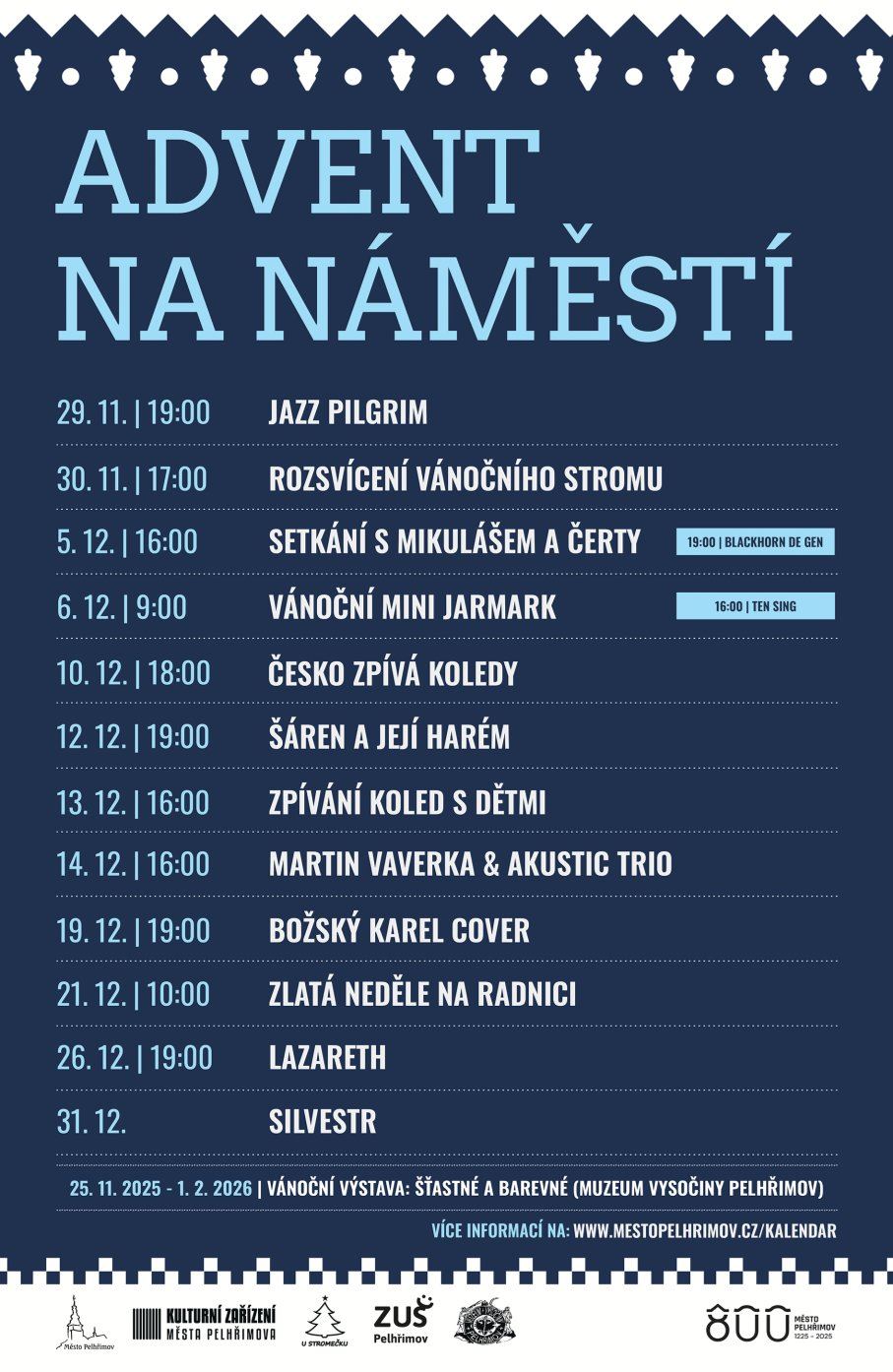 Letos mají premiéru i speciální vánoční komentované prohlídky města – Advent ve městě aneb jak to tehdy bylo, Vánoční věž sv. Bartoloměje a Vánoční tradice v Pelhřimově. Více naleznete v programu Kulturních zařízení. Mezi stálice programu naopak patří oblíbený stánek u Stromečku s tradičním občerstvením i příjemnými koncerty (Blackhorn de Gen, Lazaret, Božský Karel Cover, JazzPilgrim, Šáren a její harém, Martin Vaverka, Česko zpívá koledy). Tradiční bude i čertí program na náměstí 5. prosince. Celkové náklady na letošní adventní akce, kulturní program a doprovodné aktivity se pohybují kolem 150 tisíc korun. Město se přitom snaží zachovat vyváženost mezi bohatostí programu a rozumným hospodařením.
