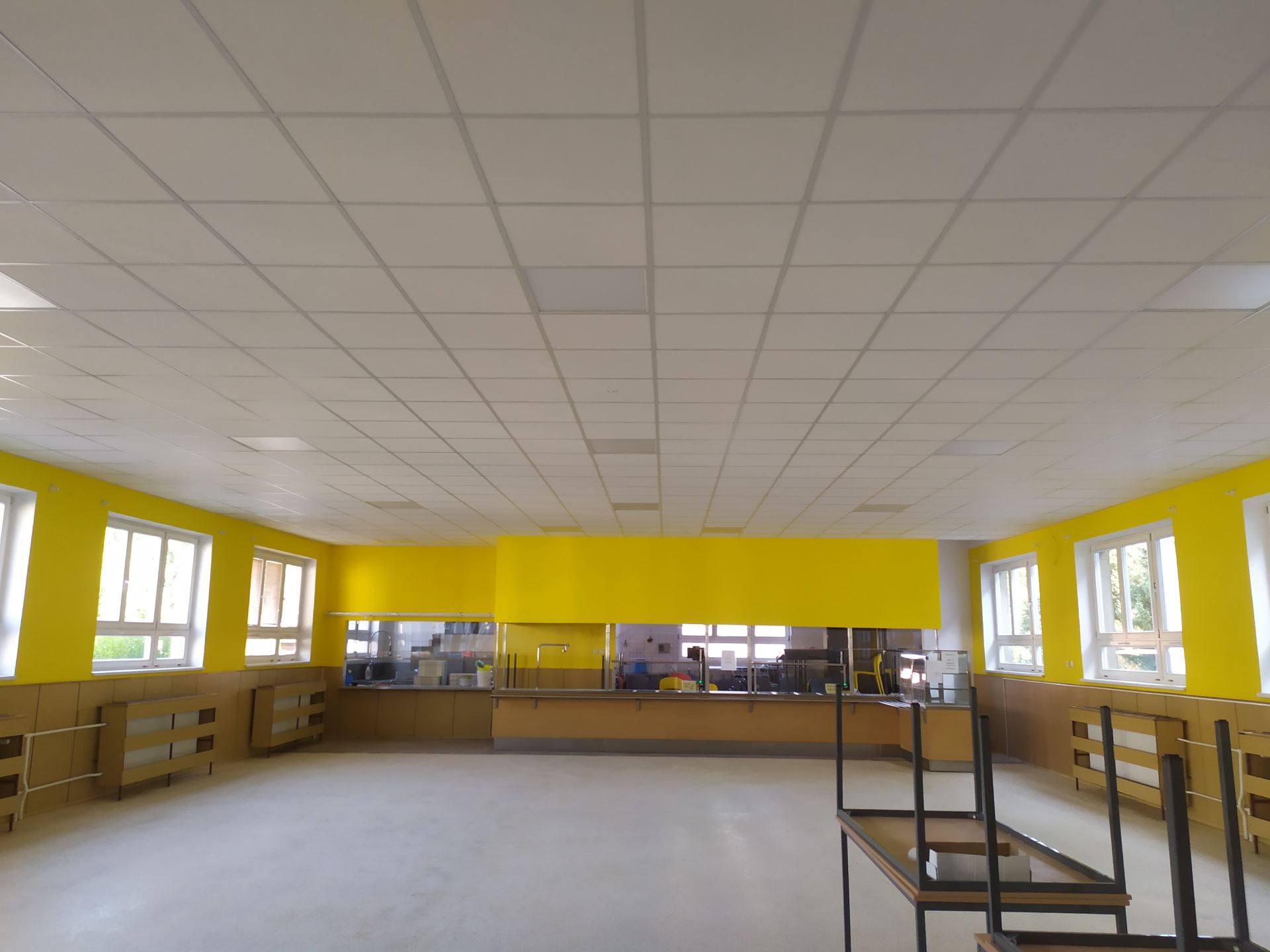 Ve školní jídelně docházelo k nadměrnému hluku způsobenému vysokými stropy a velkou koncentrací žáků. Jako nejefektivnější řešení bylo navrženo snížení stropu pomocí zavěšeného akustického podhledu se speciálními akustickými deskami. Součástí úprav byla také instalace nového osvětlení.