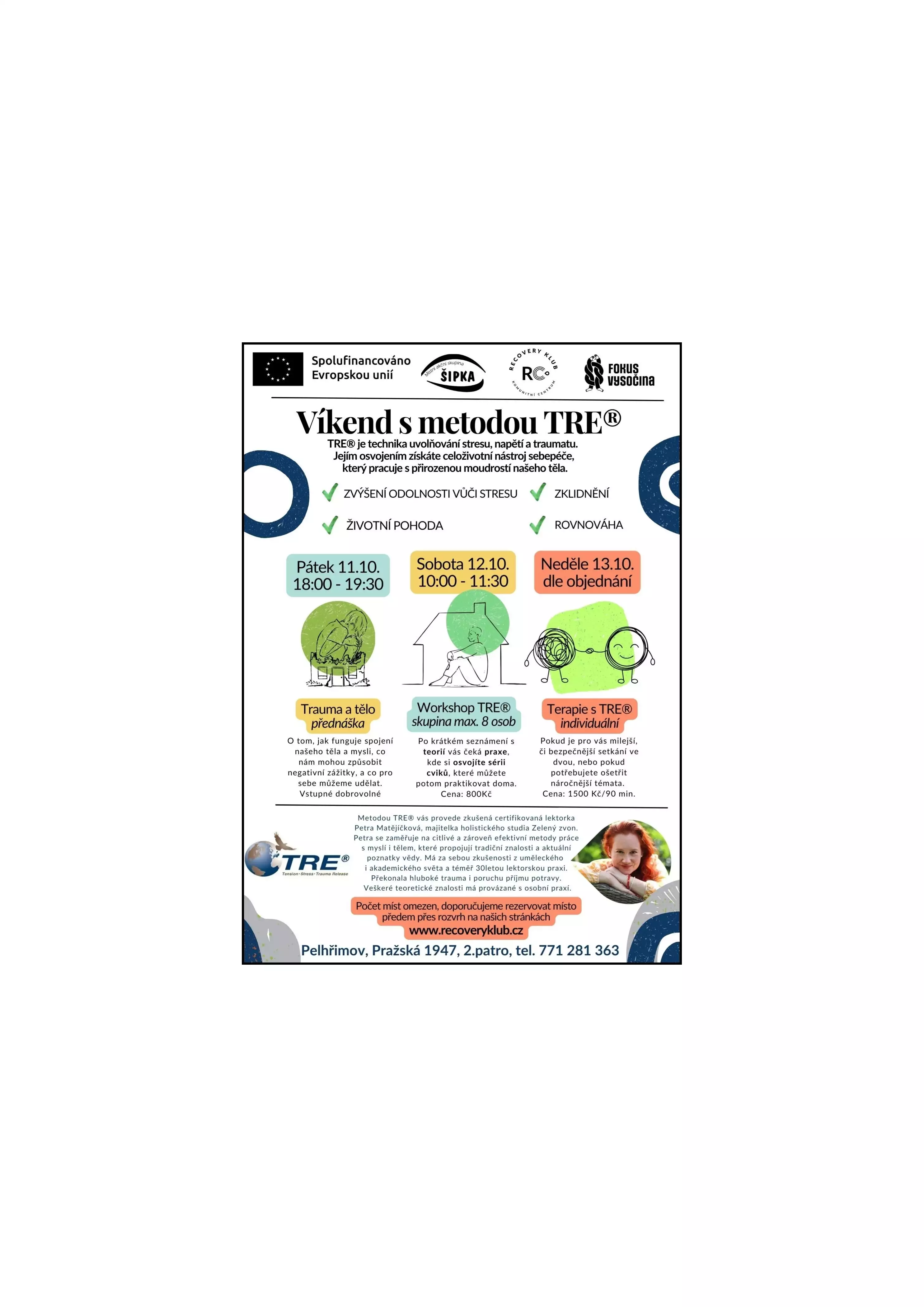„Rozebereme trauma, stres a tělo v souvislostech, povíme si o dávných instinktech, které ovládají na pozadí náš nervový systém, o provázanosti a vzájemném ovlivňování našeho psychična a fyzična a také o tom, jak si můžeme v případně nepohody, stresu, či napětí pomoci. V sobotu a v neděli máte možnost naučit se metodu TRE® prakticky,“ informovala komunitní pracovnice Recovery klubu Marie Magdalena Houšková.