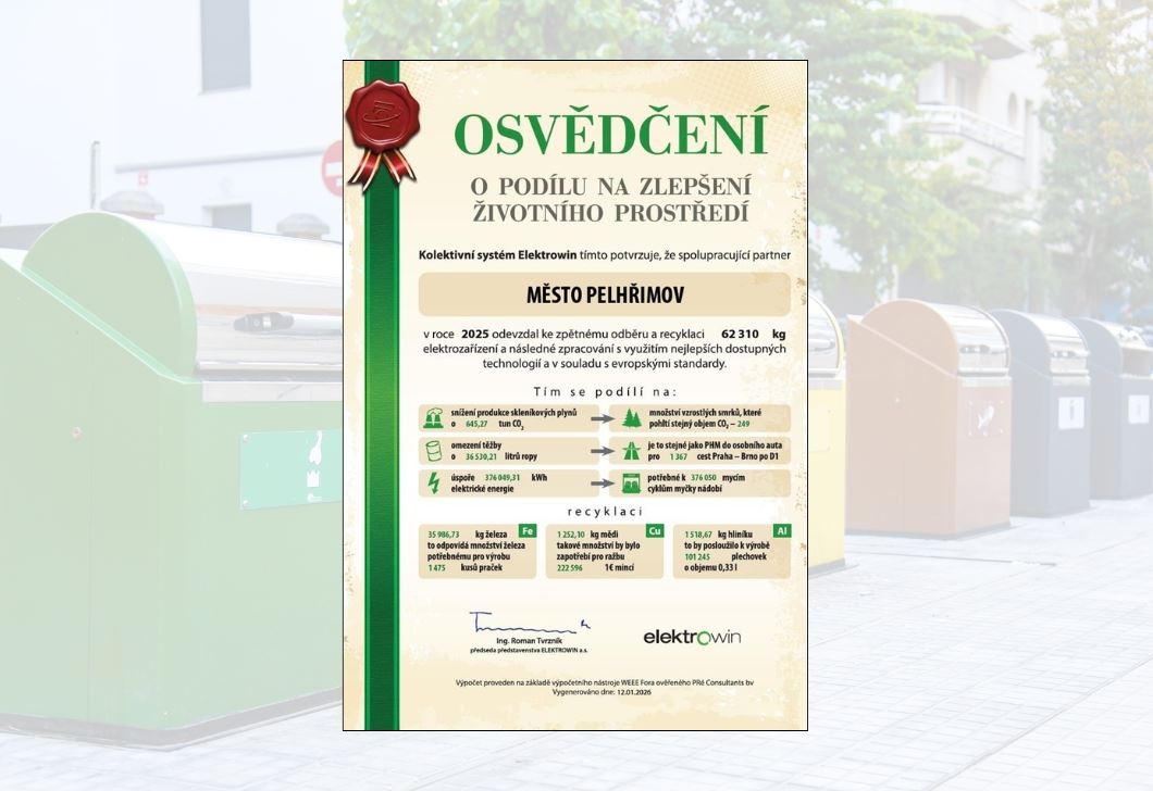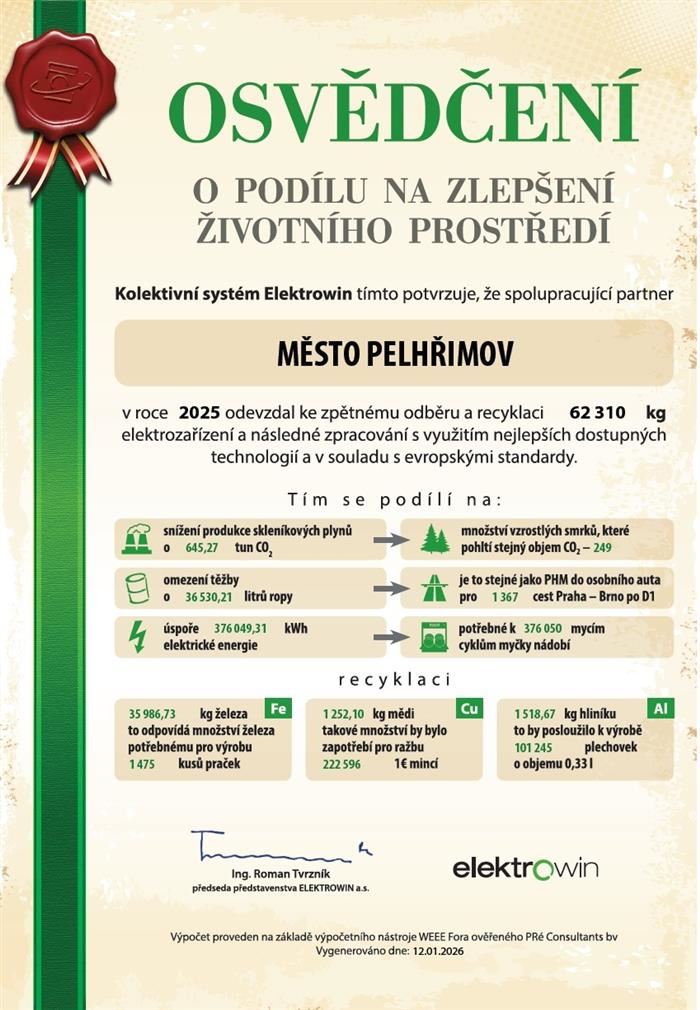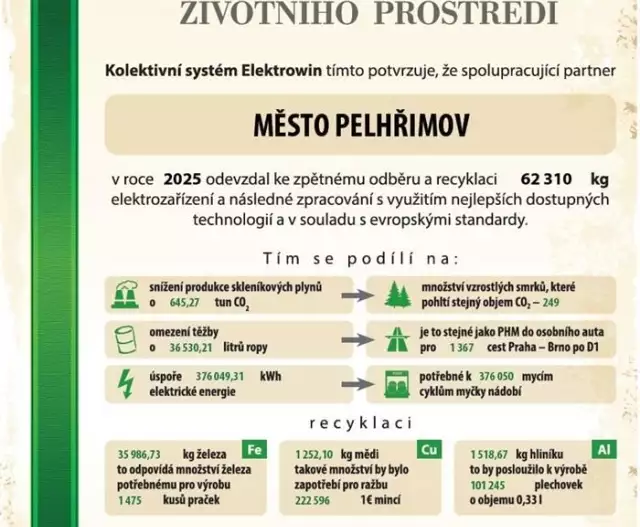 Konkrétní přínosy shrnuje Osvědčení o podílu na zlepšení životního prostředí, které město obdrželo od kolektivního systému Elektrowin. Z něj vyplývá, že díky recyklaci elektrozařízení došlo v roce 2025 k: