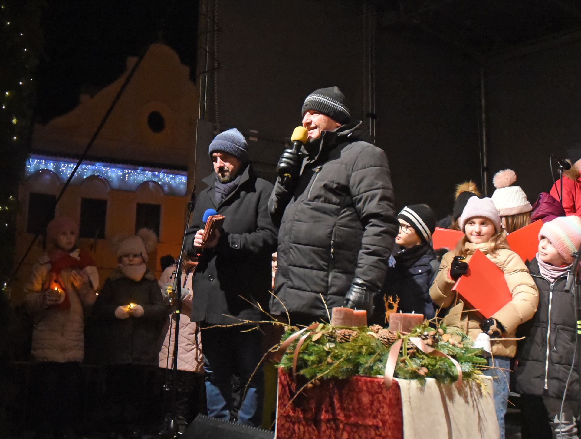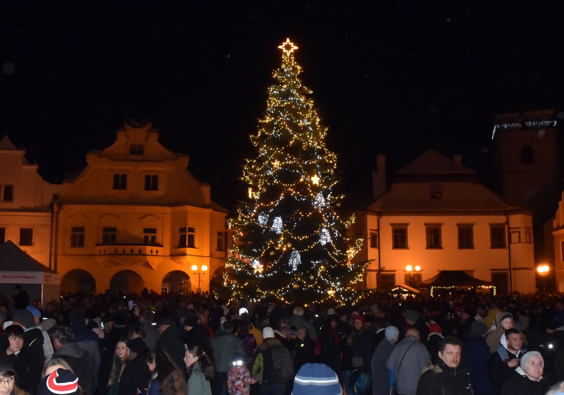 Masarykovo náměstí se v neděli 30. listopadu zaplnilo lidmi, kteří si nenechali ujít slavnostní rozsvícení vánočního stromu. Letos se středem pozornosti stala třináctimetrová jedle, která desítky let rostla v ulici Na Výsluní. „Dovolte mi poděkovat rodině Šimákových a rodině Brabcových, kteří se rozhodli tento strom věnovat městu, aby mohl potěšit nás všechny,“ uvedl na pódiu starosta Ladislav Med.