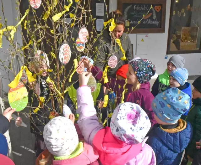 Velikonoční krásu můžete od středy obdivovat na Masarykově náměstí. Prostory podloubí před radnicí a přilehlými obchody zdobí sedmnáct březových stromečků – takzvaných vajíčkovníků. „Věšeli jsme na ně ozdobičky,“ pověděla pětiletá Barunka ze třídy Sluníček MŠ U Stínadel.