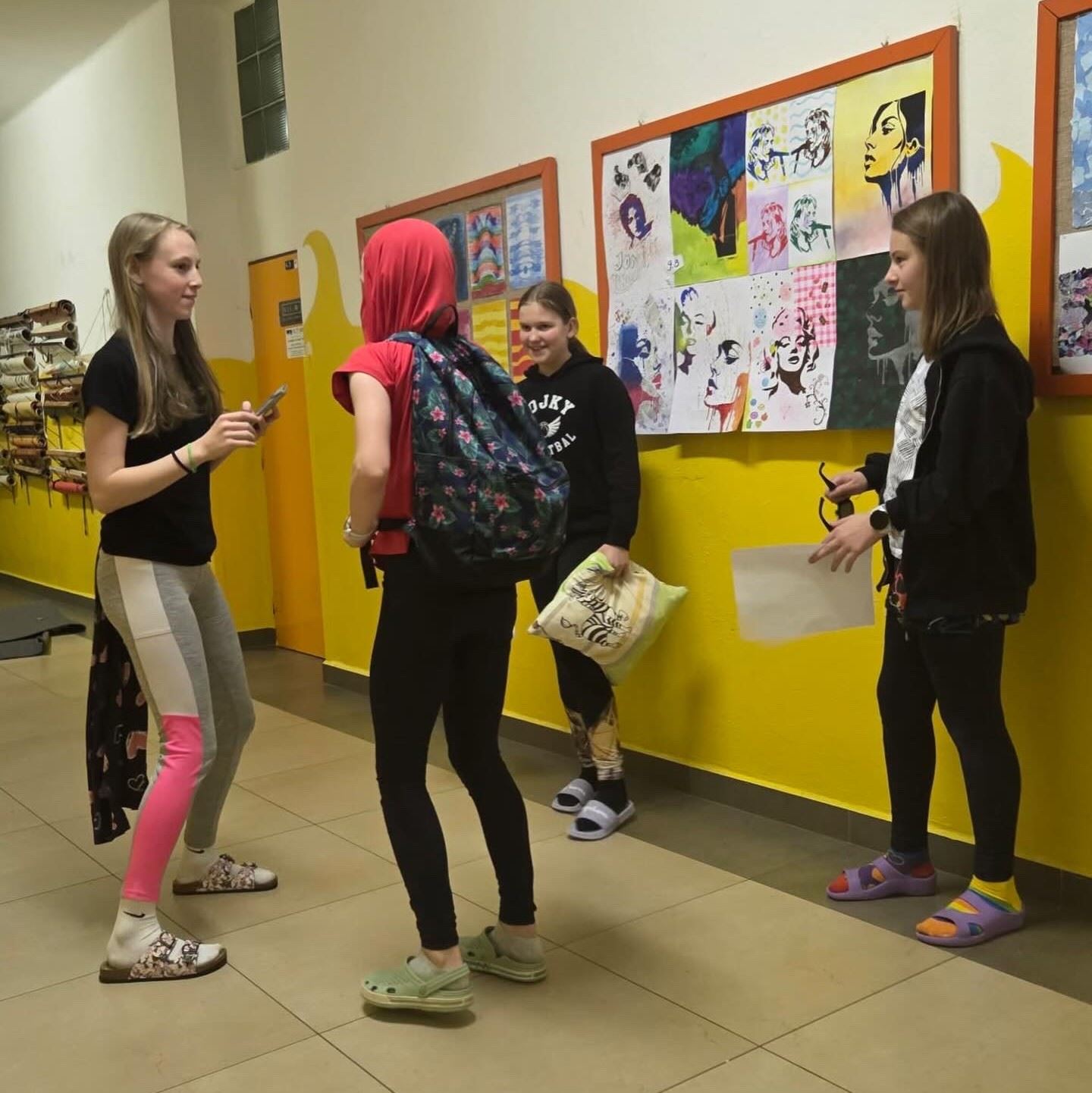 Večer jsme s paními učitelkami šli do tělocvičny, zahráli si míčové hry a „vlajkovanou“, zahráli jsme si pohádku O červené Karkulce a objednali večeři, nechyběla ani úniková hra.