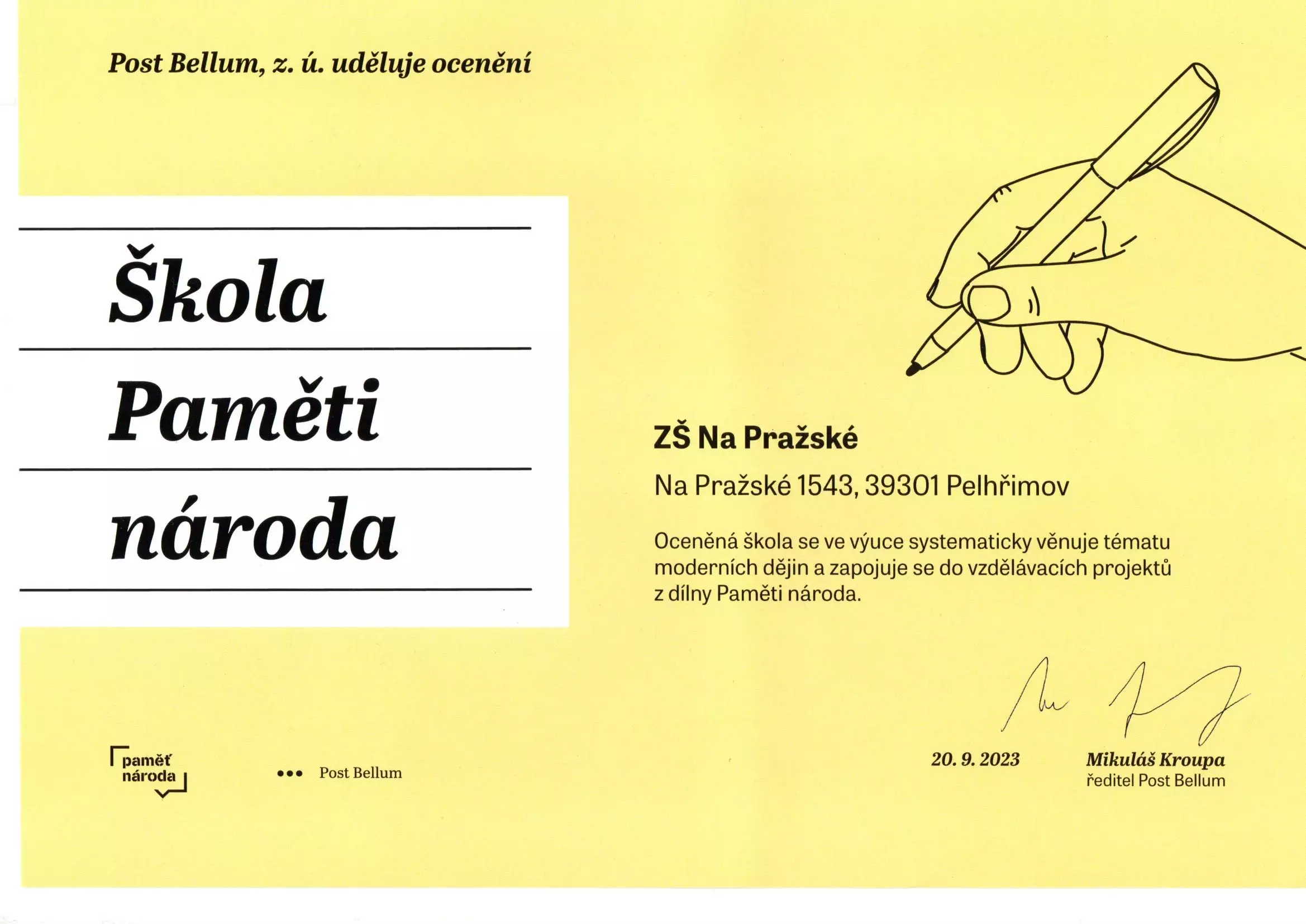 Základní škola Na Pražské se stala Školou Paměti národa
