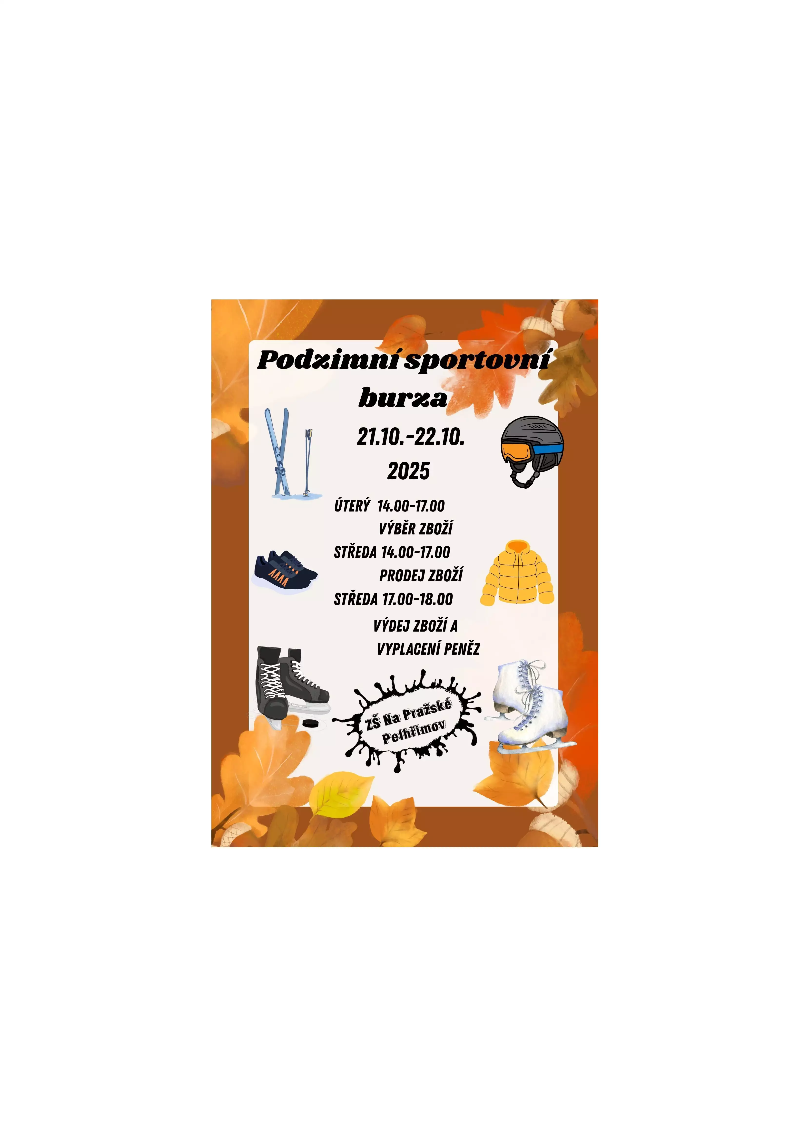 Máte doma lyže, ze kterých děti vyrostly? Nebo kolo, které už nepoužíváte, ale mohlo by odvést dobrou službu někomu jinému? Nebo naopak sháníte sportovní potřeby a nechcete nutně investovat do koupě nových? Pokud ano, pak je následující informace pro vás. ZŠ Na Pražské pořádá ve dnech 21. a 22. října burzu sportovních potřeb. Více informací se může dozvědět na přiloženém letáku.